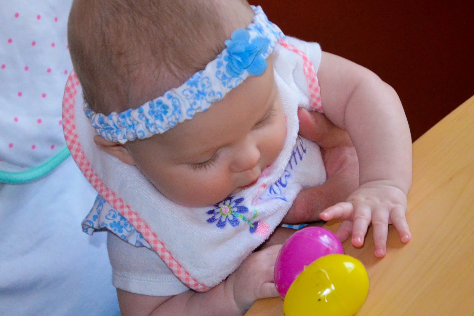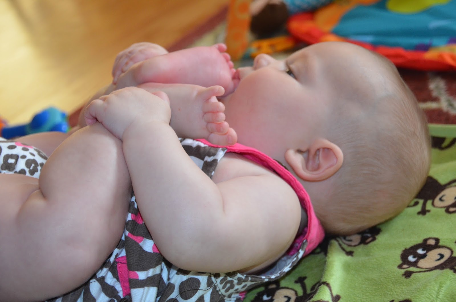 Milestones: Grabbed her feet 3/28. She rolled from back to tummy 4/17.