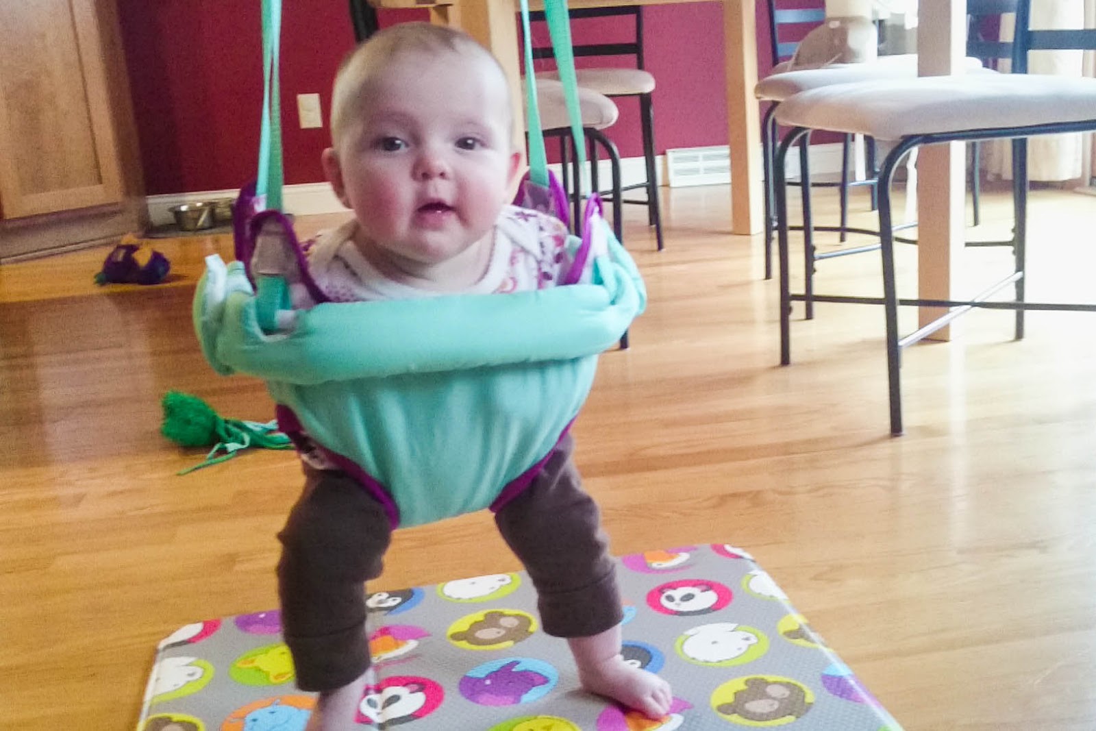 She’s also been practicing hard rolling over. The day before she turned 5 months, she actually did it. Of course Chris and I weren’t paying attention and by the time we saw her she was flopped on her stomach with her arms pinned beneath her. She has yet to attempt that again. But she’s been playing in the jumper lately and totally gets a kick out of being free to move around as she pleases.
