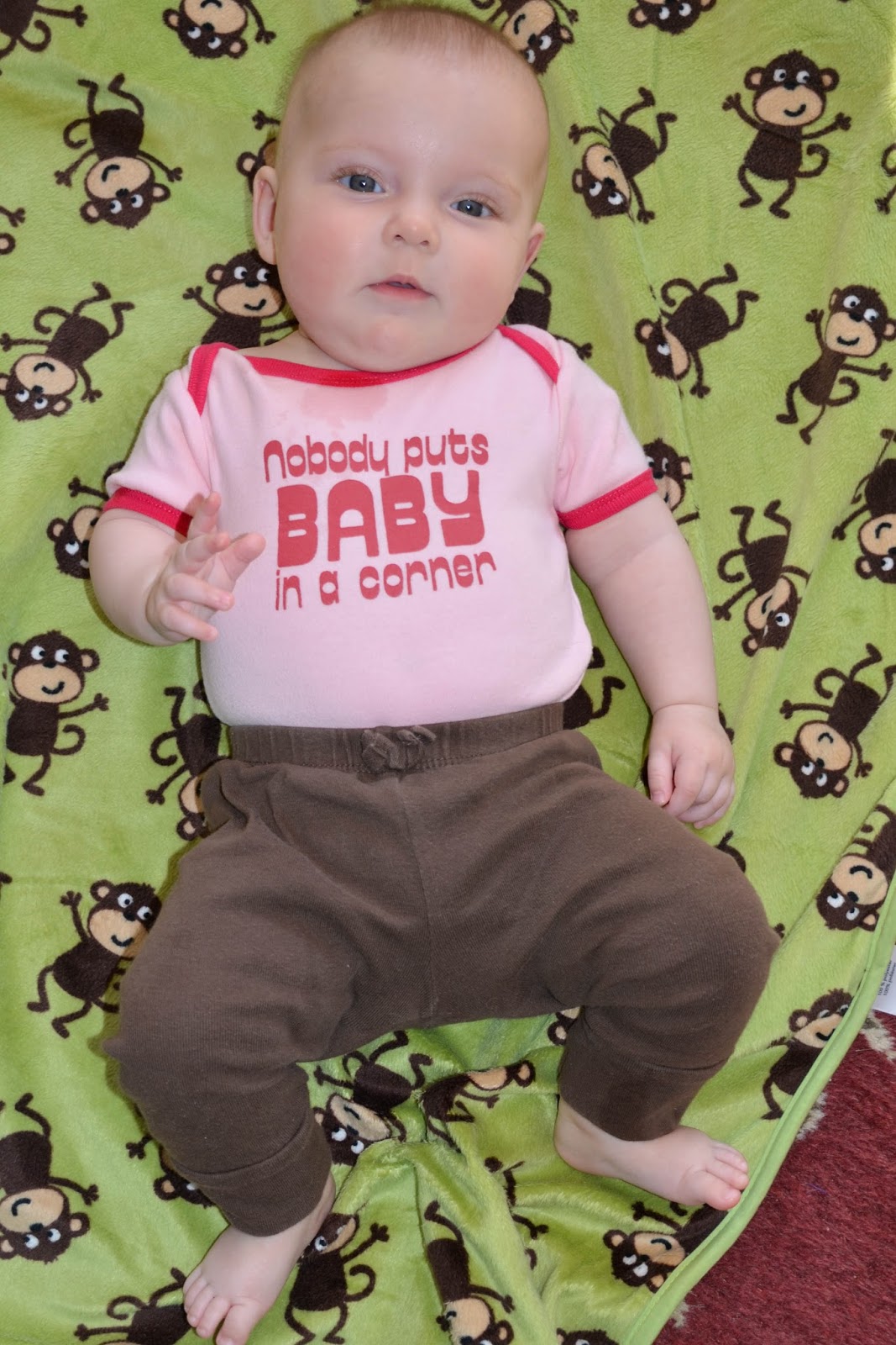 Sleeping: Can I just say “see above” and leave it at that? In the start of month four, she was starting to wake earlier at night, 1-2:00am verses her old 3-4:00am. But now she’s up between 11 and 12 many times, and again 2-3 hours later. After that, I don’t know what she actually does because that’s when I pull her into bed with me from sheer exhaustion. Sometimes she’s in bed with me by 10:00.