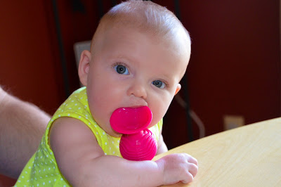 Likes: Yelling to hear herself. Scooting around on her back. Watching us eat. Frantically sucking and gnawing on things. Anything. Her teething monkey. Blankets. Knuckles of Mommy and Daddy and random strangers. Walls. She’s still loving her walks. She discovered her feet earlier in the month and is all about them now.