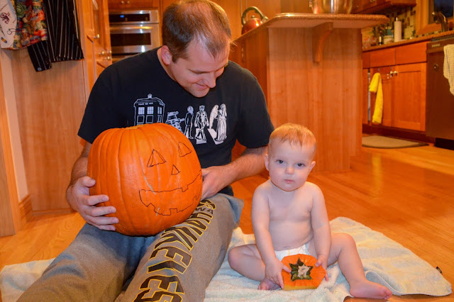 I didn't think to have my daughter get down to just underwear to carve the pumpkin this year, but she thought that it was "slimy" and not so much fun so she didn't help for too long. Oh well.
